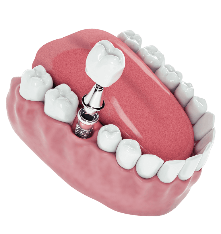 Полностью разрушенный или отсутствующий зуб можно восстановить с помощью искусственной зубной коронки, установленной на имплантат — дентальный корень из титанового сплава.